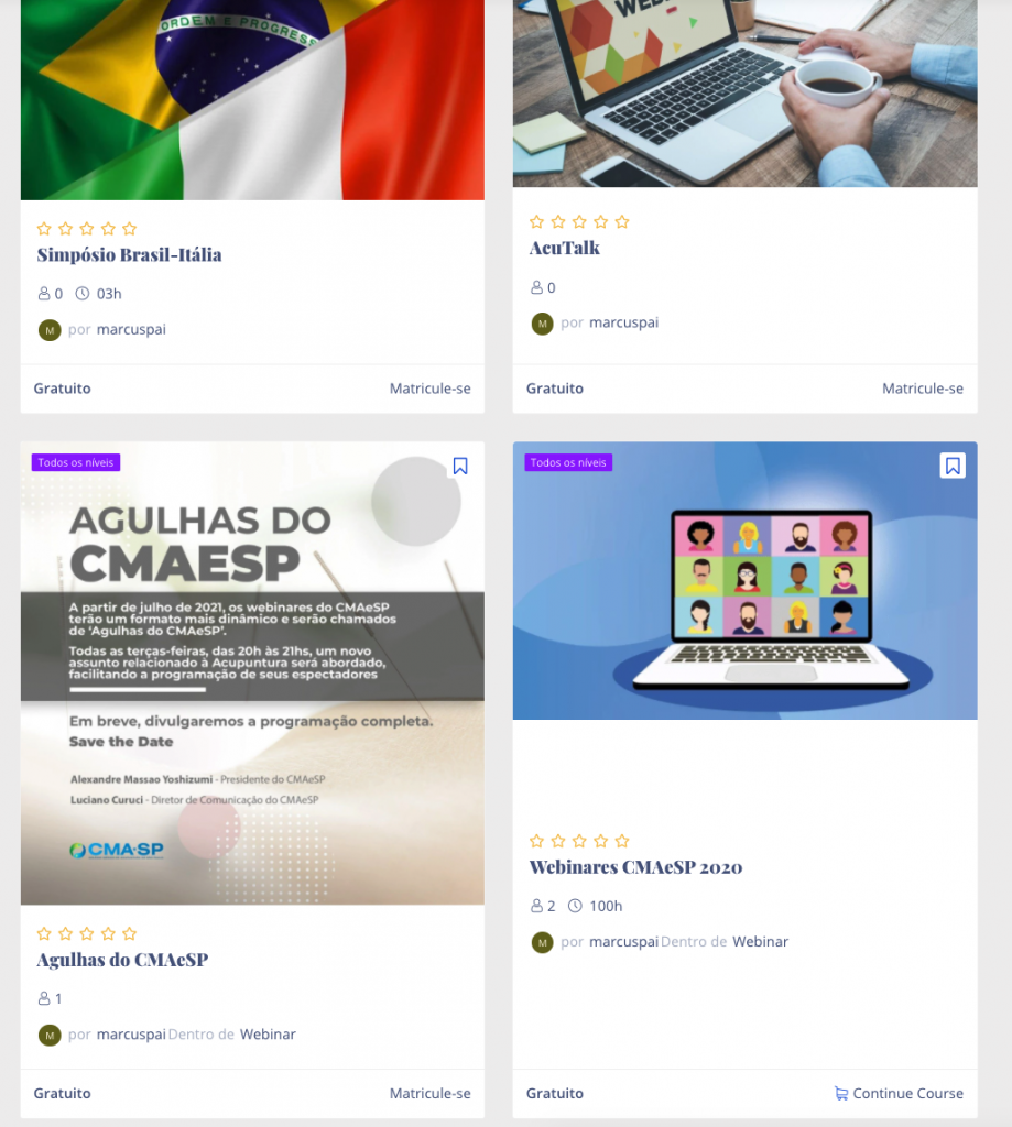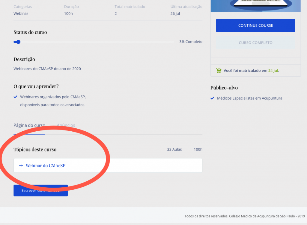 1- Selecione a opção desejada: Webinares CMAeSP 2020, Agulhas do CMAeSP, ou outros módulos gratuitos.