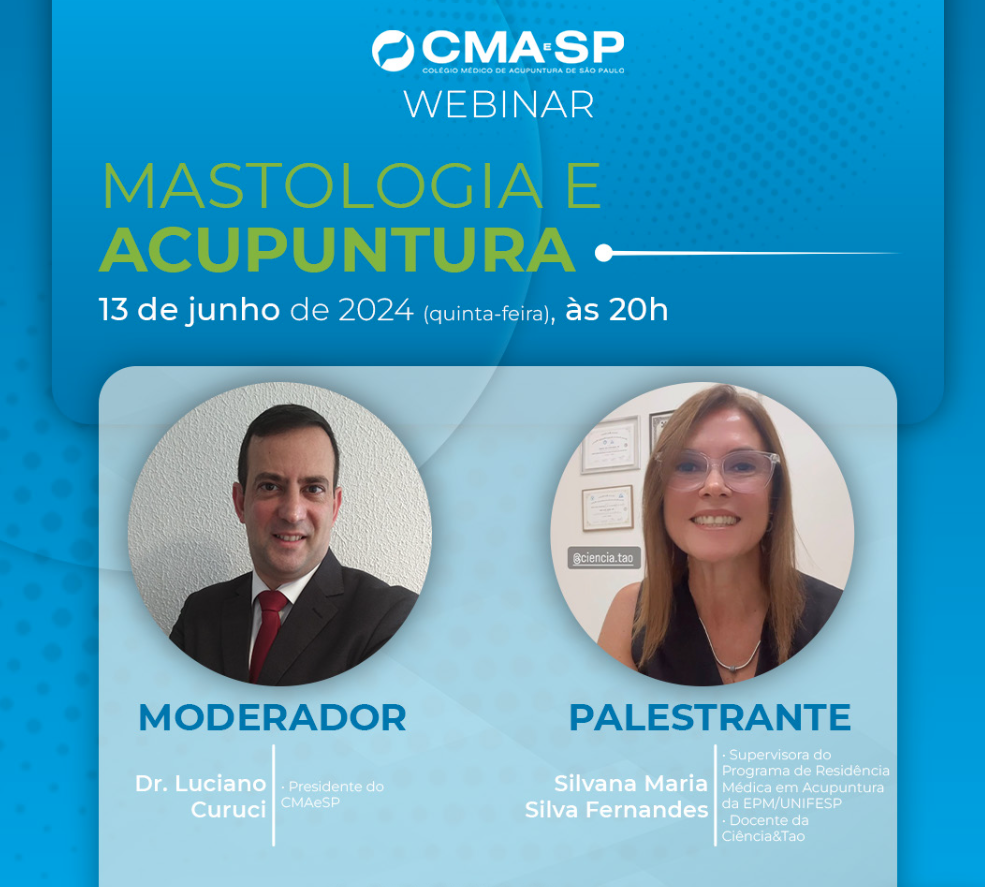 EXCLUSIVO PARA SÓCIOS ADIMPLENTES DO CMAeSP e CMBA 2024 DATA: 13/06/2024 HORÁRIO: 20:00 TEMA: Mastologia e Acupuntura PALESTRANTE: Dra. Silvana Maria Silva Fernandes MODERADOR: Dr. … [Ler mais ...]
