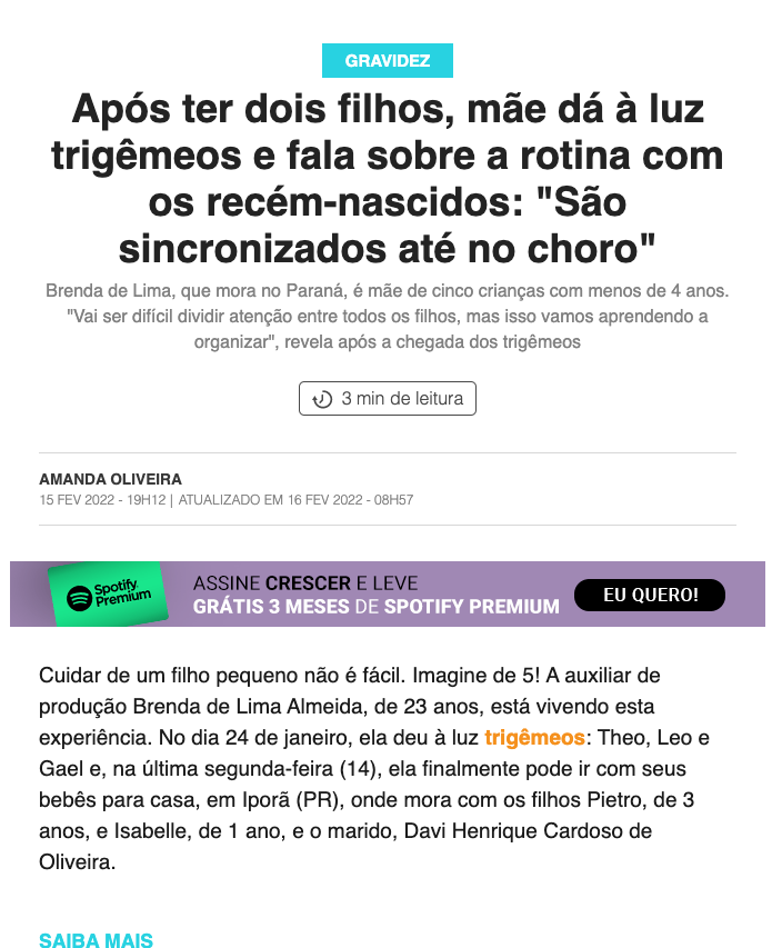 21 fev Na mídia Fonte: Após ter dois filhos, mãe dá à luz trigêmeos e fala sobre a rotina com os recém-nascidos: “São sincronizados até no choro” – Revista Crescer | Gravidez (globo.com)